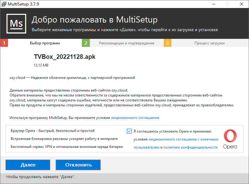 OXY下载器安装的第一步,是一个推荐的软件安装广告,推荐的是Opera浏览器,如果不想安装Opera浏览器可以将勾选取消。单击左面的按钮,下一步继续。