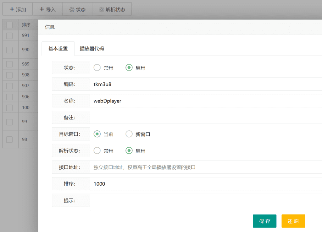 苹果cms后台:视频>播放器>添加