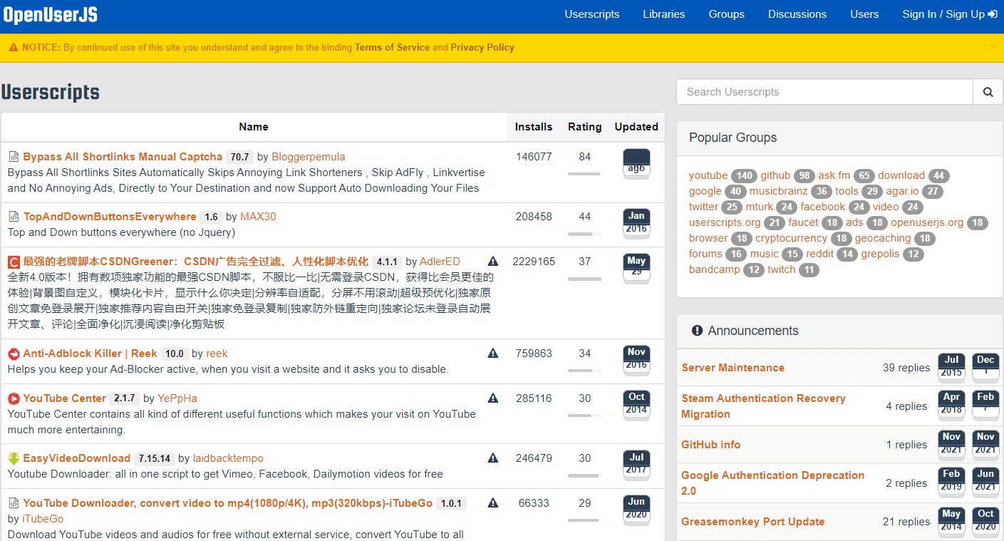 除了使用 Tampermonkey 自带的油猴脚本搜索以外,也可以通过其它网站获取 Tampermonkey 油猴脚本 ,Tampermonkey 油猴脚本 的下载渠道主要有下面几个网站: