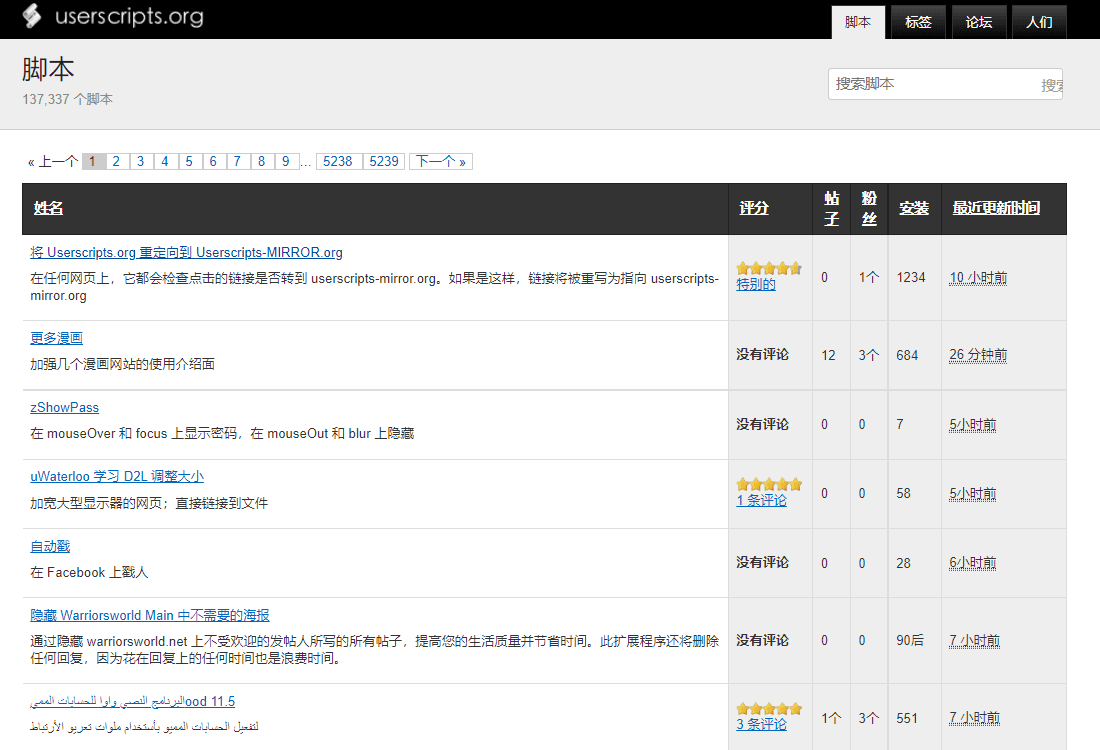 greasyfork.org 中文适配最好,userscripts-mirror.org 资源最多但网站已经不再维护可能存在垃圾和病毒脚本,因此建议新手在 greasyfork.org 上下载脚本。此外,你也可以在 Github 和 Gist 中寻找所需要的脚本资源。