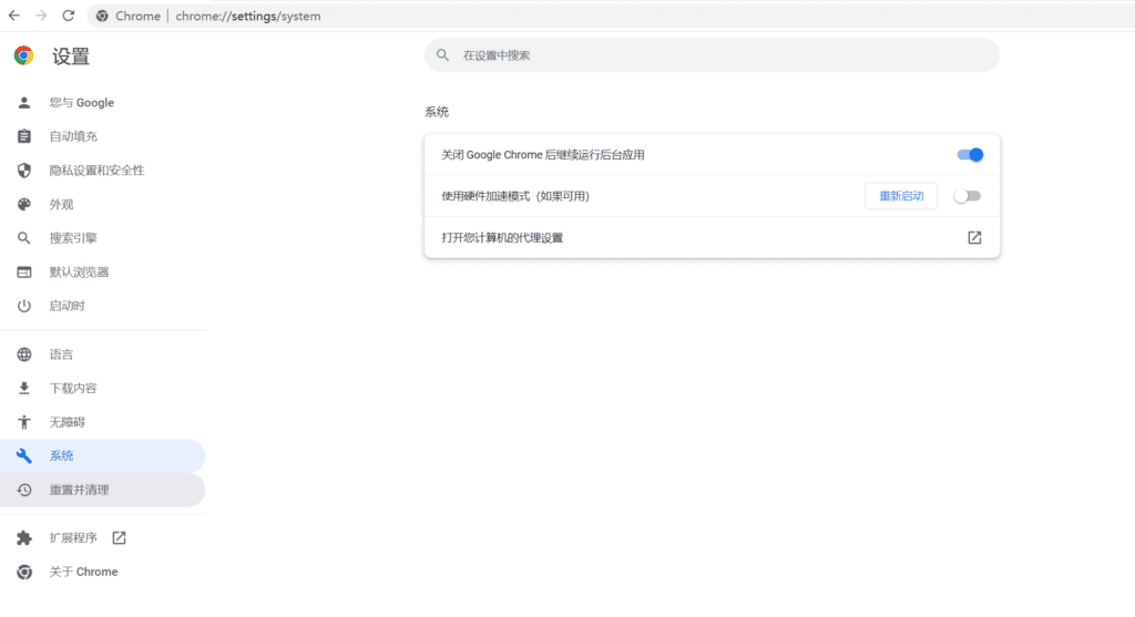 在设置菜单中,找到系统,点击进入系统,将使用硬件加速模式(如果可用)关闭,重新启动浏览器后问题即可解决。
