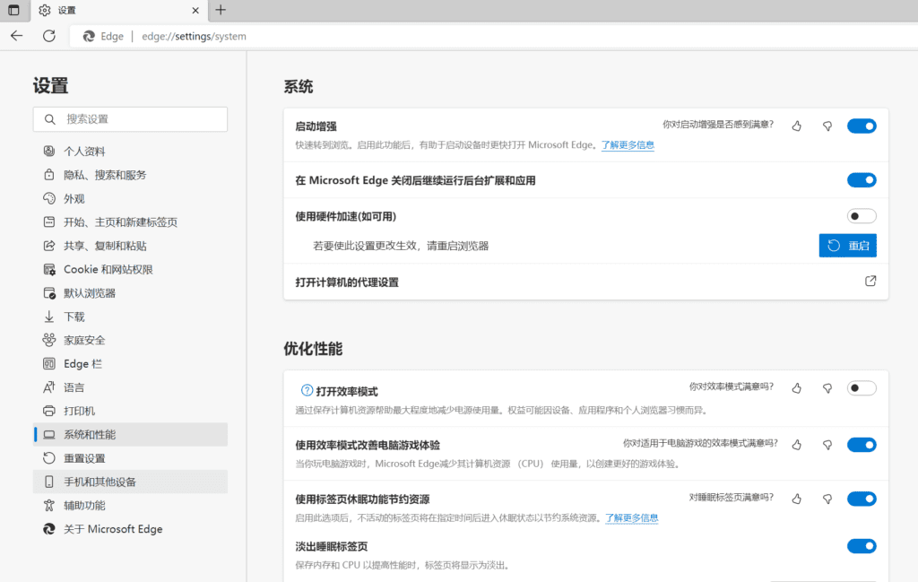 在设置菜单中,找到系统和性能选项,将使用硬件加速(如可用)的开关关闭。然后重新启动浏览器既可。