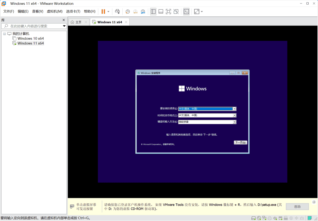 重新启动虚拟机,虚拟机会自动连接到U盘进行启动。之后进入到Windows11安装步骤。