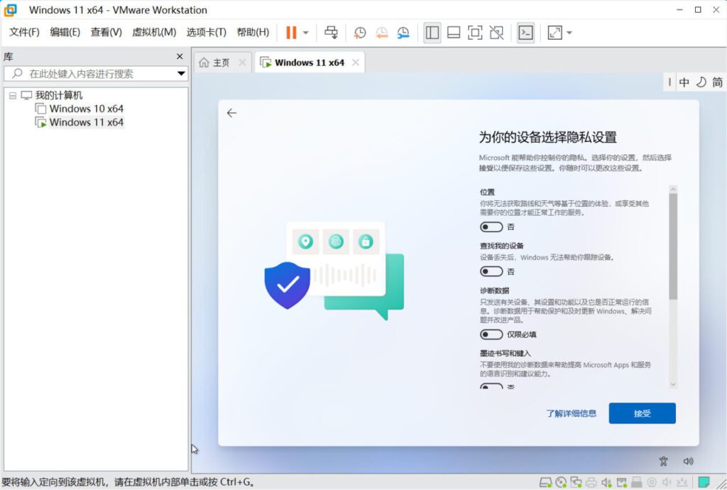 将设备选择隐私设置全部关闭,然后点击接受后,Windows11的安装已经全部完毕了,接着耐心等待进入系统就可以了。