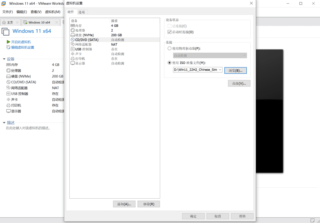 在虚拟机界面点击CD/DVD(SATA),会弹出虚拟机设置,点击CD/DVD(SATA),连接选择使用ISO映像文件,浏览电脑,选择你之前下载的win11的映像文件。选择完毕后,点击确认。