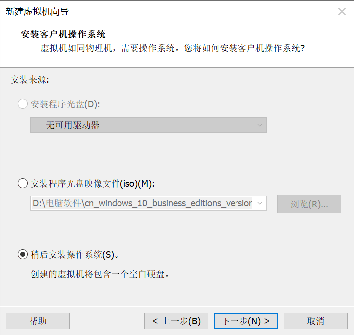 在选择操作系统这一步,选择稍后安装操作系统,目前VM还不支持Windows11