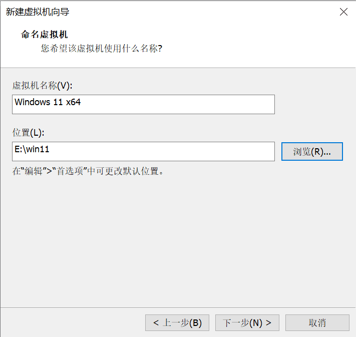 虚拟机名称自定义填写,例如Windows 11 x64,虚拟机保存位置选择一个较大的硬盘即可。
