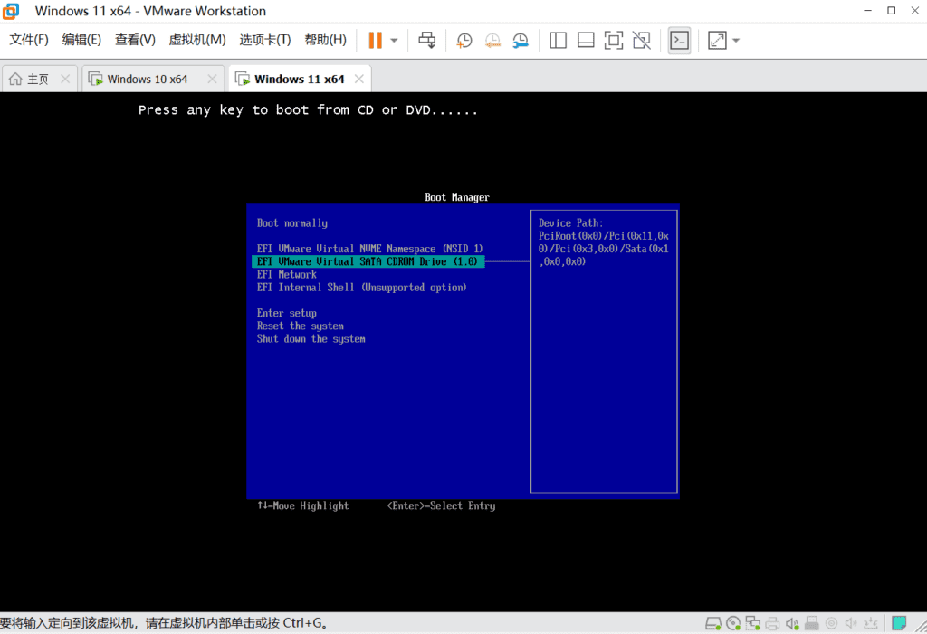 选择 EFI VMware Virtual SATA CDROM Drive(1.0)