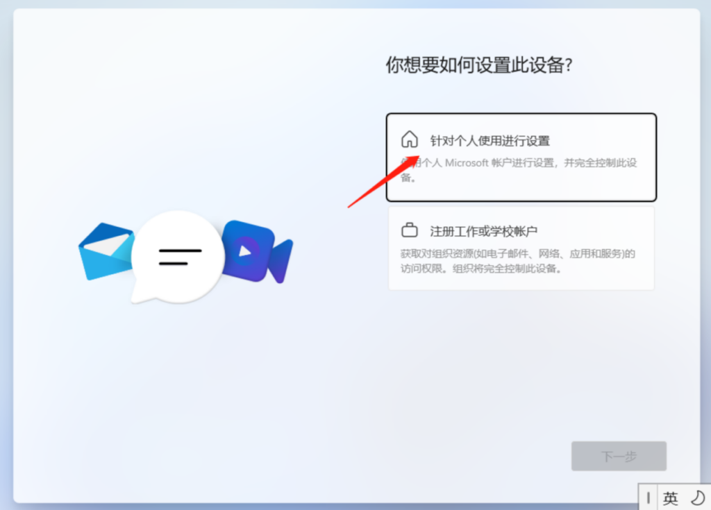选择设备设置,是个人用户使用还是工作或学校用户。默认选择个人用户。