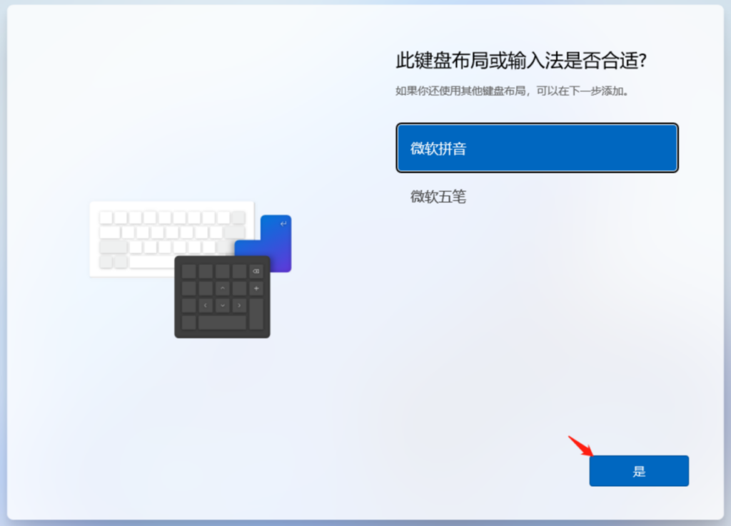 键盘布局选择微软拼音,当然如果你会五笔输入法的话也可以选择微软五笔,后期在系统中可以更改输入法。