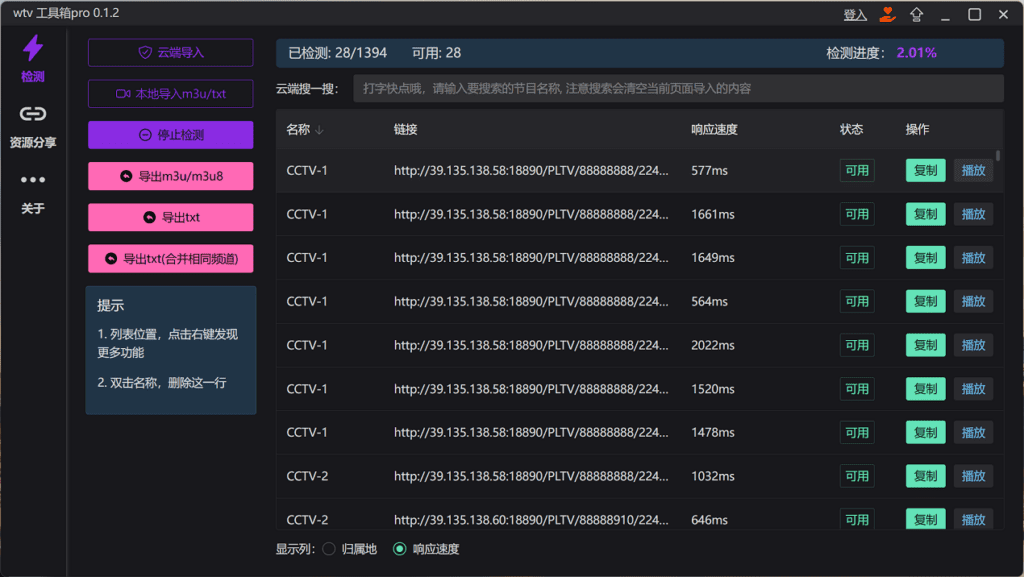 有时候很多的 M3U8直播源都是过期无效的,手工检测的话,很麻烦也很耗费时间和精力,偶然发现一个方便快捷的小工具。用来检测 M3U8直播源 非常方便。wtv工具箱 不仅可以检测海量直播源的可用性,而且还可以批量检测每一个直播源的速度,还是非常不错的。