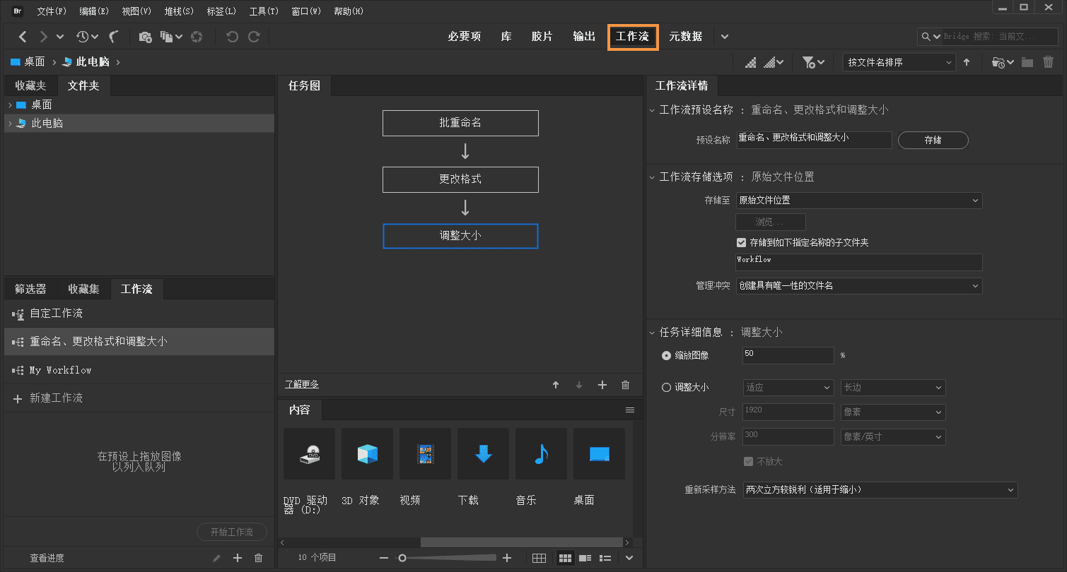 在此版本中,Bridge 引入了一个新的工作区 - 工作流。利用这个工作区可轻松组合各种任务并将其拼结在一起,从而创建您自己的可供重复使用的工作流。只需在工作流预设中拖放资源,即可对作业进行排队;单击开始工作流则可以运行作业。可以从应用程序栏访问工作流工作区。