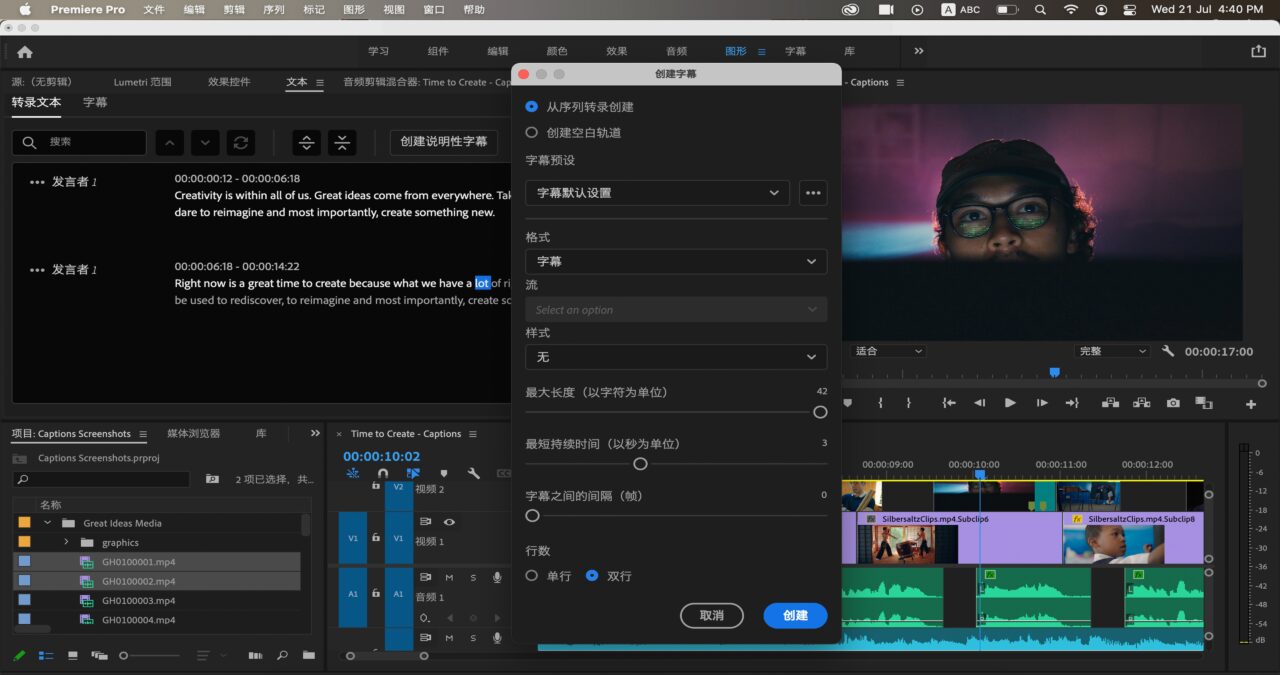 由 Adobe Sensei 提供支持,语音到文本将转录转换为时间轴上的字幕项,利用机器学习来匹配对话的自然节奏。