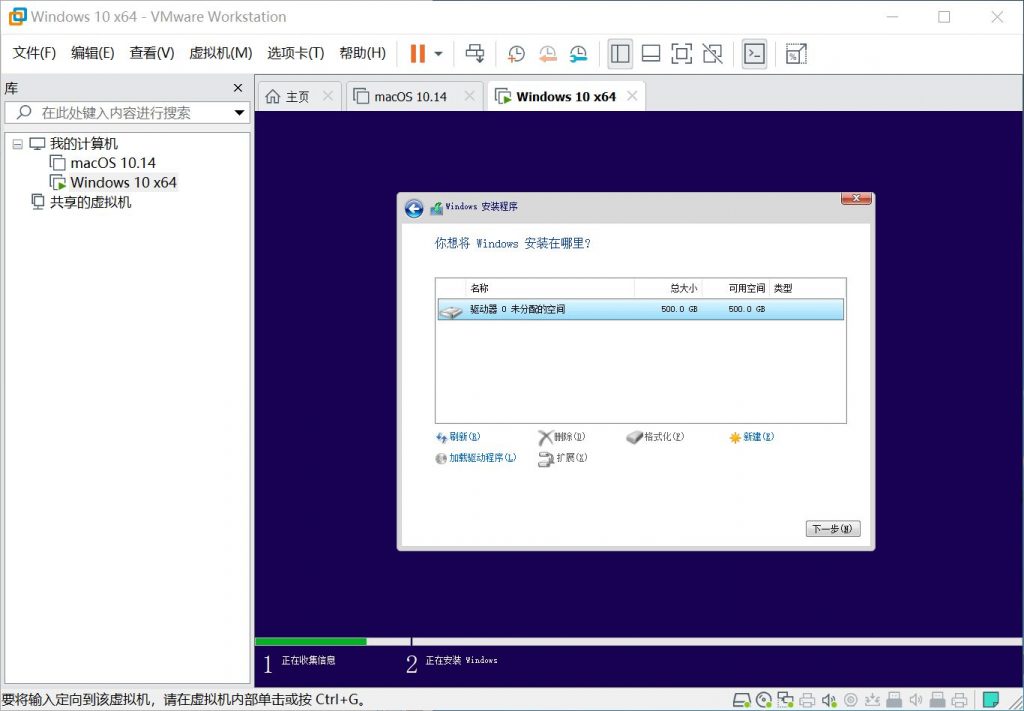 下面开始安装Windows10企业版,选择安装全新的操作系统,500G的虚拟机,主硬盘分区分200G用来安装一些常用软件测试。设置好分区后进行安装。