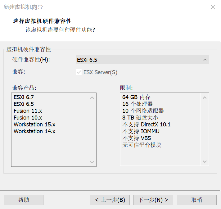 选择虚拟机硬件兼容性,硬件兼容性这里选择ESCi6.5.默认的Workstation15.x这个选择后会安装黑屏,可能是硬件不兼容。
