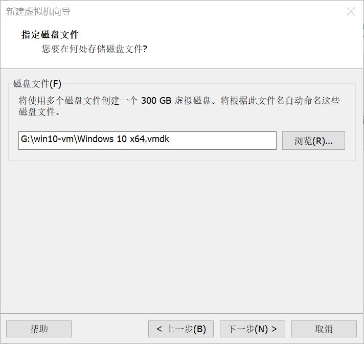 指定磁盘文件,您要在何处储存磁盘文件?选择之前建立好的G盘的win10-vm目录保存磁盘文件。