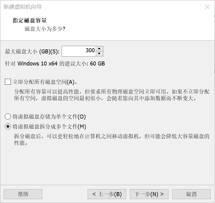 选择磁盘,创建新虚拟磁盘,指定磁盘容量,磁盘大小为多少?系统默认60G,不够的话可以加大,当然不要大过你的物理硬盘大小。默认将虚拟硬盘拆分成多个文件,这里可以选择虚拟机文件是一个文件,还是多个文件。