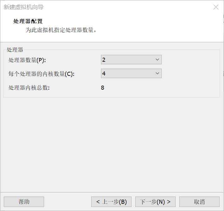 处理器配置,这里不要设置太高,设置高了会影响真实机器的性能。下一步:
