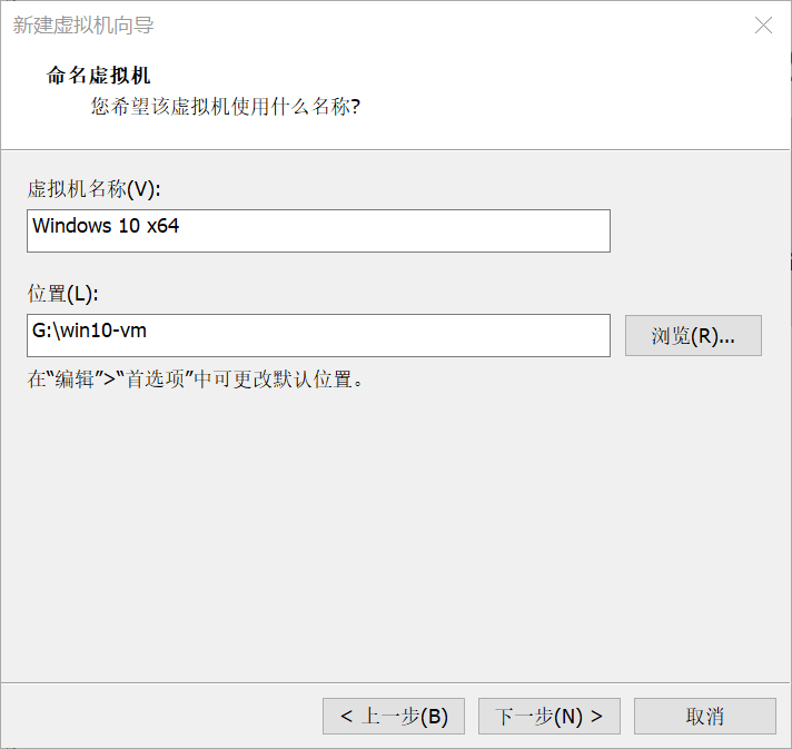 命名虚拟机,您希望该虚拟机使用什么名称?这一步名称可以默认,也可以自定义,最重要的是虚拟机的安装位置,默认的是C盘,这里我们给它改一个盘符。在G盘下新建一个win10-vm目录。下一步: