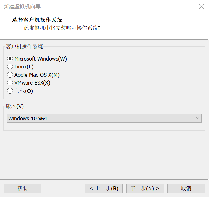 选择客户机操作系统,这里选择版本windows10 X64。下一步: