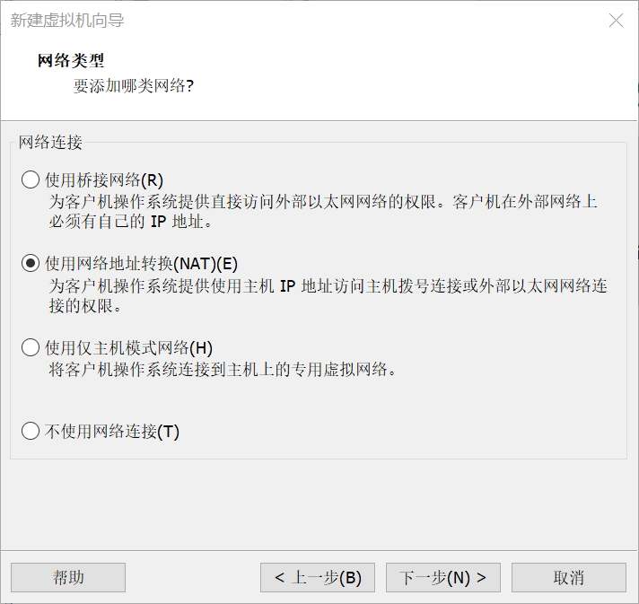 网络类型,这个选项默认是使用网络地址转换(NAT),使用默认选项,下一步: