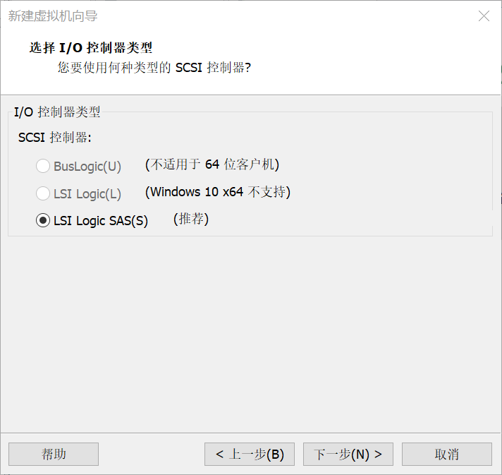 选择i/o控制器类型,默认LSI logic SAS选项,下一步: