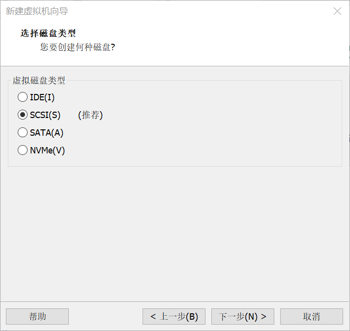 选择磁盘类型,默认选择SCSI(推荐),不需要更改,下一步