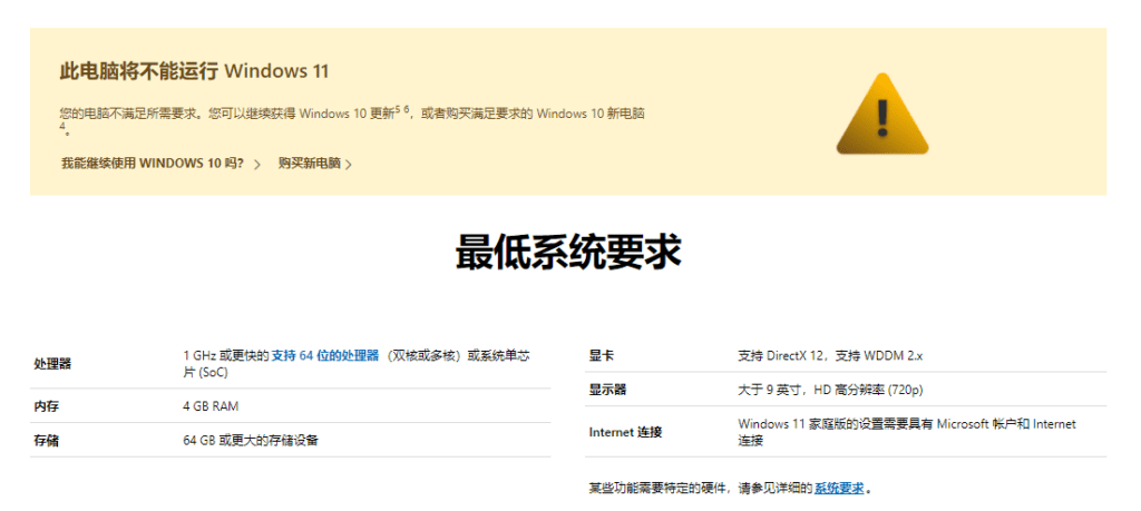 如果你的电脑不满足安装Windows11的需要,页面上会提示错误!