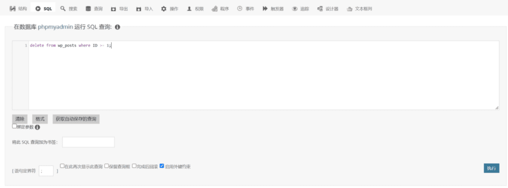 首先在phpmyadmin中,打开你wordpress的数据库,点击SQL选项,运行SQL查询。