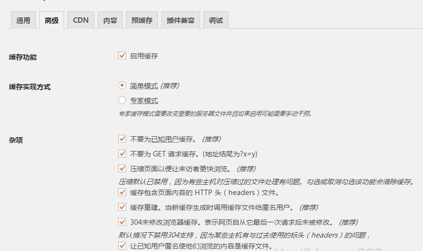安装好WP-Super-Cache并启用后到Settings选项中进行设置,具体设置如下: