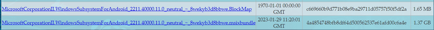 - 下载文件(文件链接日后更新会失效,如果无法现在链接,请在上面网站重新搜索下载):MicrosoftCorporationII.WindowsSubsystemForAndroid_2211.40000.11.0_neutral_~_8wekyb3d8bbwe.msixbundle