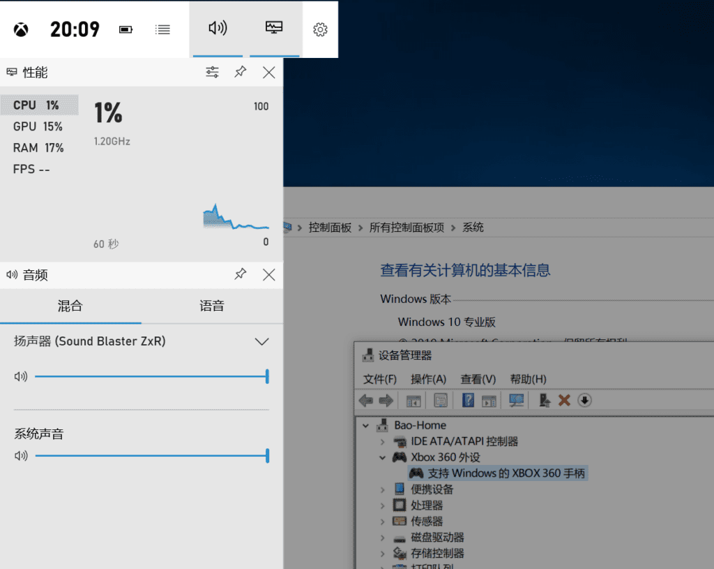 按一下手柄上的西瓜键,屏幕上会出现xbox360手柄的设置选项,win10会默认安装xbox game bar软件来支持xbox360手柄的使用。