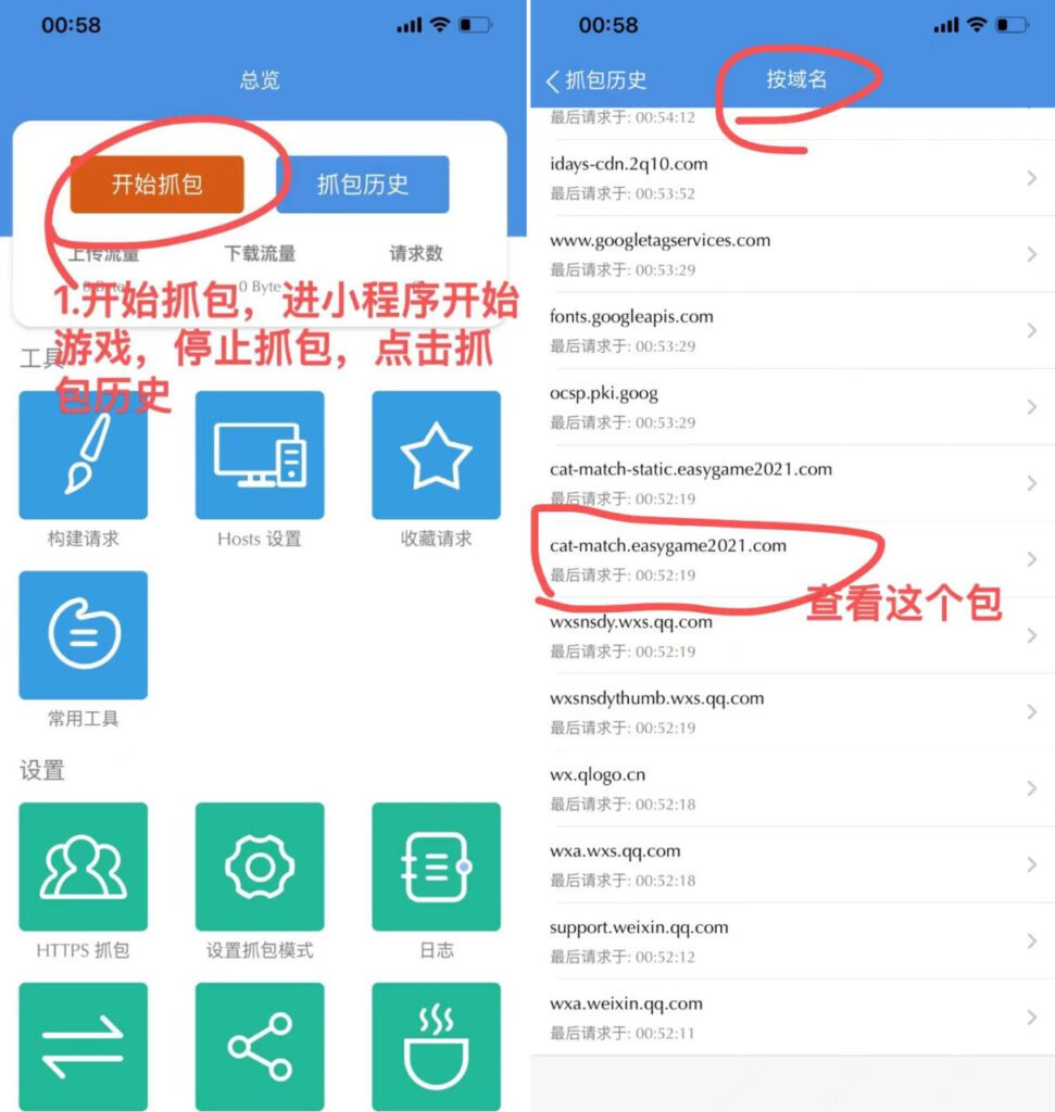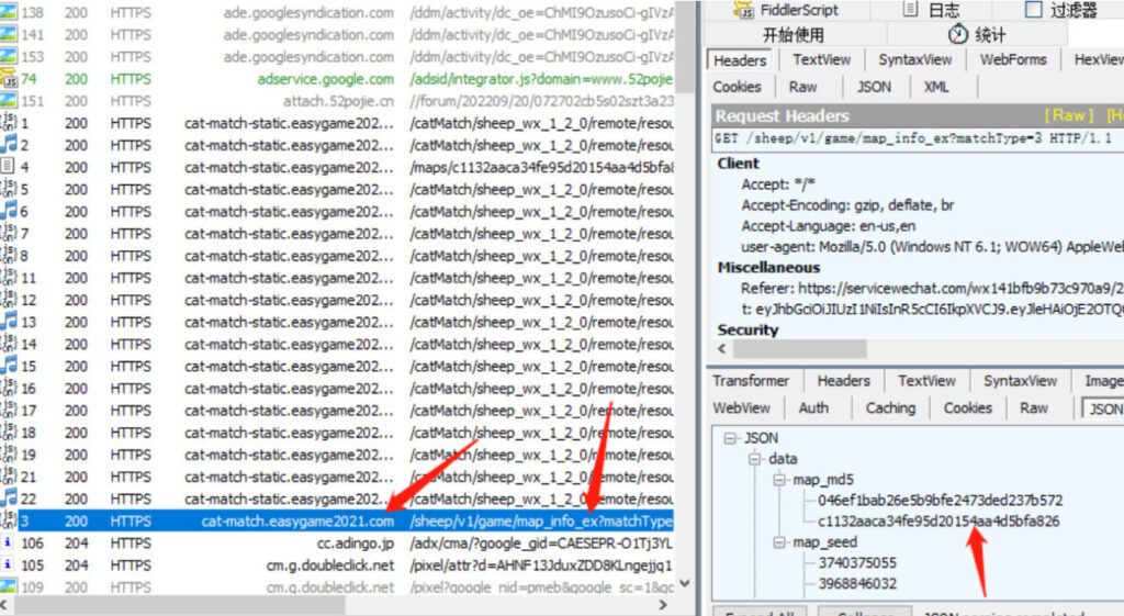 t值获取方法:随便一个抓包工具抓包,开始抓包,运行游戏,然后按域名查看“cat-match.easygame2021.com”,再随便打开一个包,看请求里面的t值。