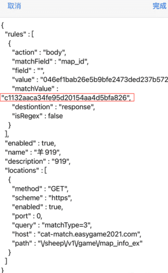 "matchValue" : "\"046ef1bab26e5b9bfe2473ded237b572\",\"(.+)\"],",