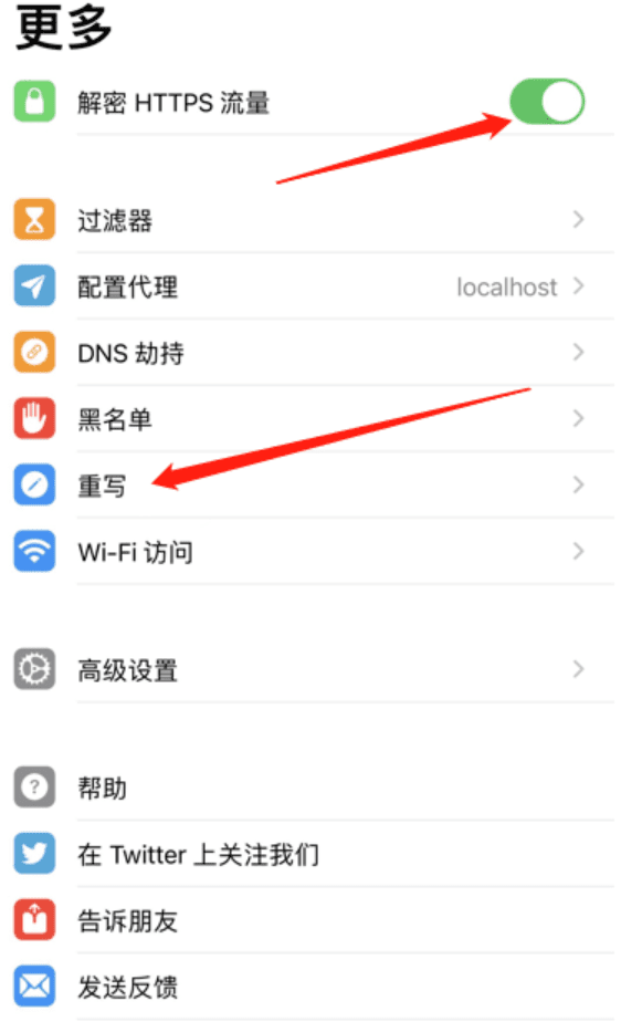 开启“解密HTTPS流量”,这里需要安装和信任证书,按提示操作即可,打开“重写”功能。