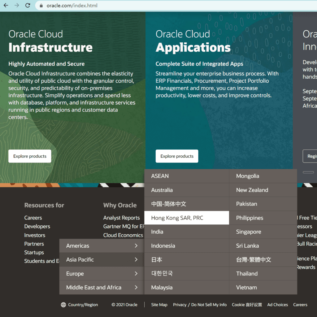 打开甲骨文网站后,将网站拉到最下面,找到小地球的标志后,将语言切换成中文。