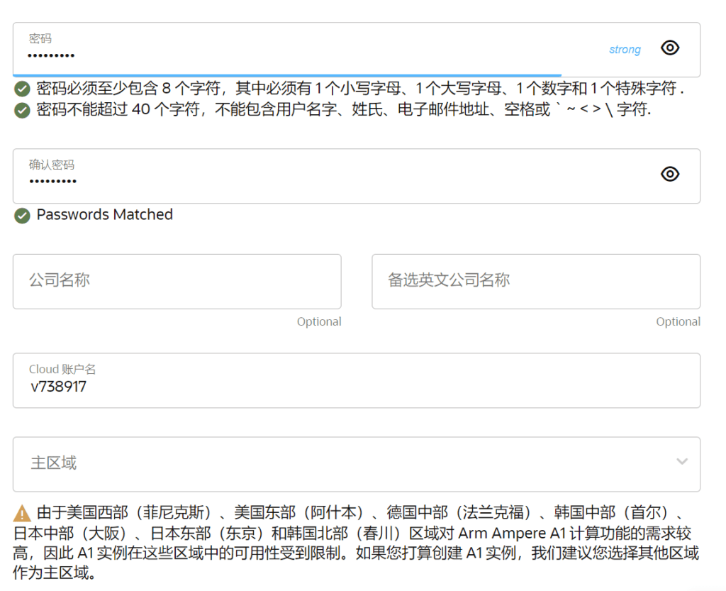 填写好你的登录密码,密码必须至少包含 8 个字符,其中必须有 1 个小写字母、1 个大写字母、1 个数字和 1 个特殊字符。密码不能超过 40 个字符,不能包含用户名字、姓氏、电子邮件地址、空格或 ` ~ < > \ 字符。公司名称这里不用填写,cloud账户名这个是系统默认分配的,也可以自定义一个账户名称。