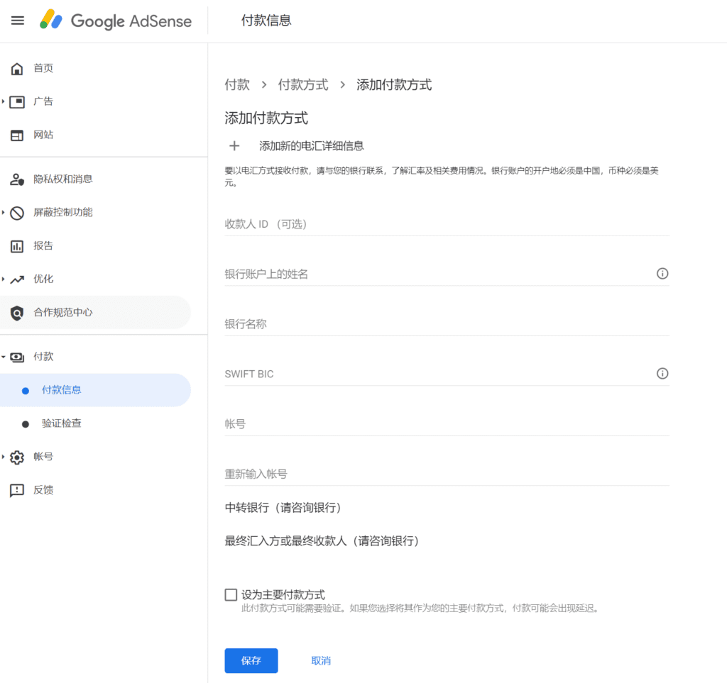 填写完毕后,勾选设为主要付款方式后,点击保存。之后等着 Google AdSense 的账户余额超过100美元后,Google的自动电汇就可以了。