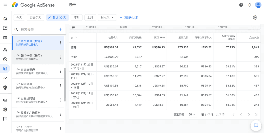 资金明细在 Google AdSense 中点击报告,然后在上面勾选最近30天,选择整个帐号(按周)