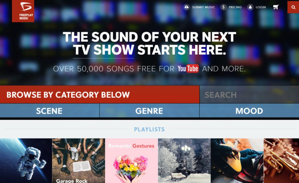 网站需要用户注册,注册后登录即可下载音乐,站内的音乐可以免费用于个人使用。商用或上传至Youtube以外的平台需付费。Freeplay Music中有超过 50,000 首歌曲免费为YouTube提供。仅限 YouTube 上的个人使用,用于在一个视频中使用一个曲目,该曲目严格出现在不产生收入的个人视频中。个人视频不得以任何方式用于宣传业务。