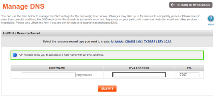 点击上面的A,即可进行A记录解析,在HOSTNAME中输入二级域名,留空则是一级域名解析。后面的IPV4 ADDRESS中输入你的服务器IP地址。然后点击下面的SUBMIT即可完成域名解析。