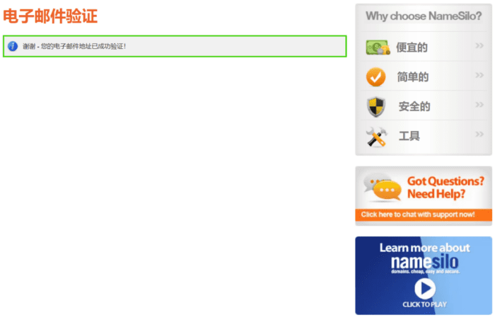 恭喜你,电子邮件验证成功,下面开始进行域名注册吧。