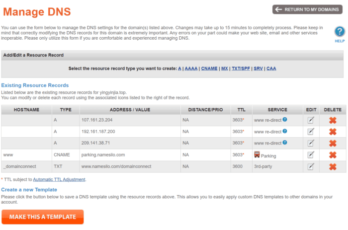 NameSilo 每 15 分钟发布一次 DNS 更改。您的更改可能需要更长的时间才能显示为有效。这种看似延迟通常是由于浏览器和/或 DNS 缓存造成的。您可以在NameSilo的DNS 故障排除页面上阅读有关这些问题的更多信息。