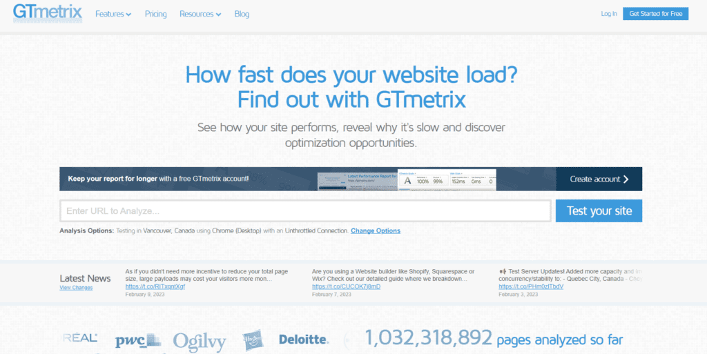 GTmetrix 查看您网站的运行情况,揭示速度缓慢的原因并发现优化机会。确保您的网站对每个人来说都很快,在不同的国家、浏览器、连接速度等条件下测试您的页面。查看您的网页在 22 个不同的全球测试地点的表现,并确保它能为全球所有访问者快速加载。立即分析,看看它的表现如何!利用 GTmetrix 使您的网站尽可能快!
