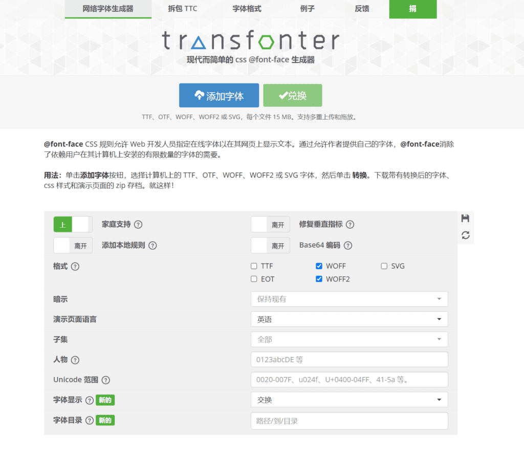 单击添加字体按钮,选择计算机上的 TTF、OTF、WOFF、WOFF2 或 SVG 字体,然后单击 转换。下载带有转换后的字体、css 样式和演示页面的 zip 存档。就这样!