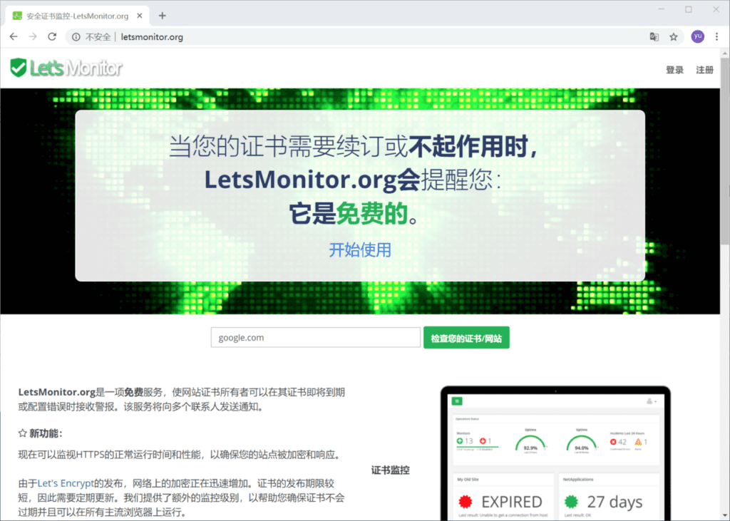 LetsMonitor.org是一项免费服务,使网站证书所有者可以在其证书即将到期或配置错误时接收警报。该服务将向多个联系人发送通知。