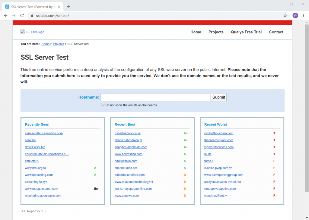 Qualys SSL Labs测试提供免费的SSL检测服务,只需要输入你想测试的网站域名,就可以得到非常全面的SSL检测报告。